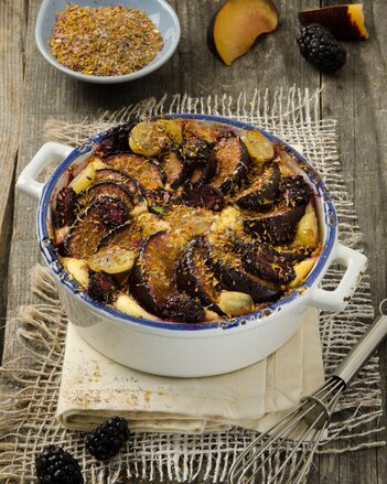 Vier ofenfeste Teller/Schüsseln mit etwas Butterschmalz ausfetten und die Topfenmasse darauf verteilen. Nun die entsteinten Zwetschgen sternförmig auf die Topfenmasse setzen und die Beeren und Weintrauben darauf verteilen.