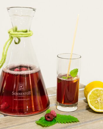 Mit Himbeeren, Zitronenscheiben und Eiswürfel dekorieren und servieren.