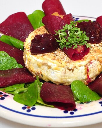 Den gebackenen Camembert in einem Nest aus Posteleinsalat anrichten und mit der Rote Bete, der Kresse und dem Preiselbeer-Fruchtaufstrich anrichten. Nach Belieben noch mit frischem Pfeffer würzen.