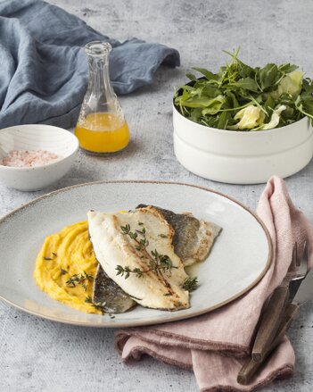 Gebratenes Forellenfilet mit Vanille-Orangen-Butter und Kürbis-Kartoffelpüree