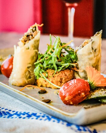 Gemüsetatar mit geschmorter Zucchini und Pilz-Bärlauchrolle