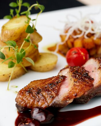 Die auftranchierte Ente mit der Glücksgewürzmischung bestreuen und zusammen mit den Kartoffeln und der Sauce auftischen und die Gäste zu Tisch bitten.