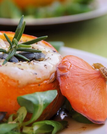 Die Kürbisse mit gerösteten Kürbiskernen bestreuen und evtl. mit Rosmarin dekorieren. Dazu passt ein Salat mit Kernöldressing.