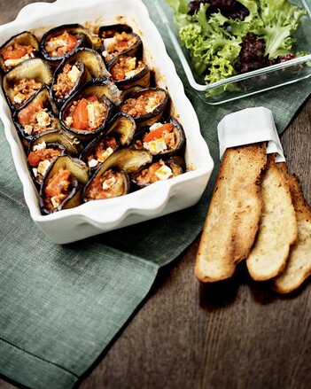 Die Melanzanischeiben mit je 1-2 Löffel Faschiertem belegen und fest einrollen. Eine feuerfeste Auflaufform mit Butter ausstreichen die Melanzanirollen einschlichten, den Reibkäse darüber streuen und bei 170 °C im Rohr 15 Min. überbacken. Aus dem Ofen nehmen und mit knackigem Salat und Weißbrot servieren.