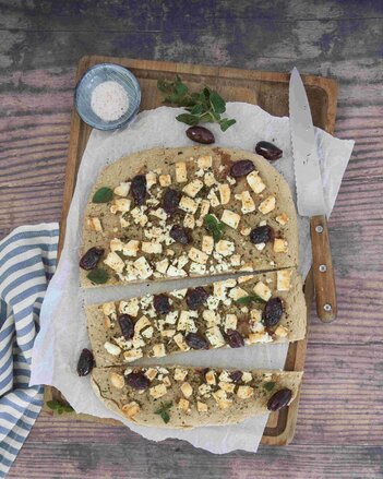 Den Teig auf ein Backpapier geben, runde Ränder an den Seiten formen und mit einer Gabel Löcher in den Teig machen. Anschließend den Teig mit der Hälfte der Basilikumöl-Mischung bestreichen, mit Schafskäse und Oliven belegen und mit Salz, Pfeffer und Laune gut, alles gut Gewürzmischung würzen.