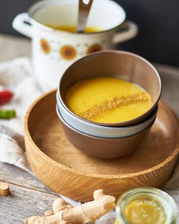 Die Suppe fein pürieren und mit Kurkuma, Salz und einer Prise Chili abschmecken.