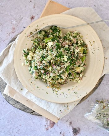 Am Ende den Reis untermischen und mit Salz, Pfeffer und Majoran würzen.