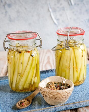 In jedes Glas 1-2 Teelöffel Einlegegewürz geben und den Sud heiß über das Gemüse geben, bis es abgedeckt ist.