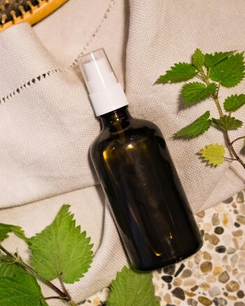 Brennnessel mit heißem Wasser übergießen und 15 Minuten ziehen lassen. Tee in eine Flasche umfüllen und etwas abkühlen lassen.
