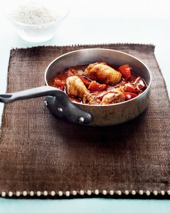 Hähnchenstücke dazugeben und zugedeckt bei mittlerer Hitze ca. 50 Minuten kochen, bis das Fleisch weich ist, eventuell zwischendurch etwas Wasser zugeben. Kurz vor dem Ende der Kochzeit die Tomaten in 2 cm große Würfel schneiden, dazugeben und kurz mitgaren.