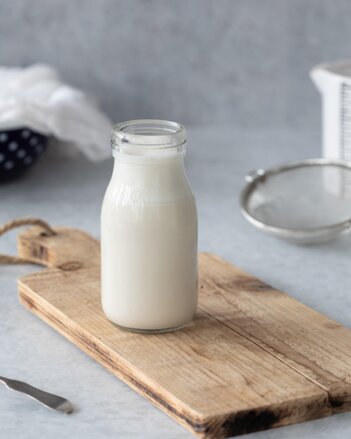 Die pflanzliche Sahne am besten in ein sauberes Schraubglas oder eine kleine saubere Flasche geben. Hält im Kühlschrank ca. 2-3 Tage