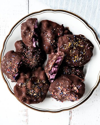 Zum Schluss mit Flower Power oder Alles Liebe Gewürzblüten bestreuen und kurz warten, bis die Schokolade fest wird.