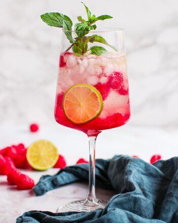 Vermischen und Glas mit Eiswürfeln, Limettenscheiben und Himbeeren auffüllen.