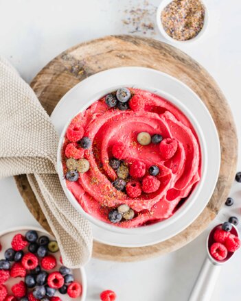 Abschließend das Fruchteis in eine Schüssel geben, 1 EL Flower Power Gewürzblüten untermischen und mit frischen Beeren und 1 EL Flower Power Gewürzblüten dekorieren. Sofort genießen oder im Tiefkühler aufbewahren.