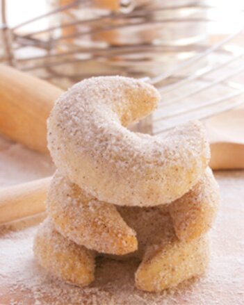 Kipferl formen und bei 180 °C ca. 12 Min. backen. Die Kipferl noch heiß im Staubzucker-Vanillezucker Gemisch wälzen.