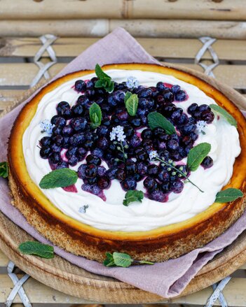 Die Heidelbeeren mit 4 EL Holunderblüten Sirup marinieren. Die Beeren hübsch auf der Creme verteilen und nach Belieben mit frischen Minzeblätter servieren.