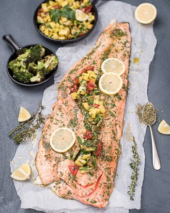Für den Lachs/Glasur: Die Petersilie waschen, von den Stielen befreien und fein hacken. Etwas Zitronenzesten abreiben. Die Zitrone auspressen. Das Olivenöl mit dem Honig, der gehackten Petersilie, dem Zitronensaft und dem Fish & Chicks Gewürz vermischen. Mit Salz und Pfeffer abschmecken. Auf der Fleischseite auf den Lachs pinseln und im Kühlschrank für ein paar Stunden durchziehen lassen. Den marinierten Lachs mit der Hautseite nach unten auf den heißen Grill legen. Für ca. 8 Minuten grillen. Anschließend auf einer weniger heißen Zone am Grill mit Deckel 8-12 Minuten fertig grillen.