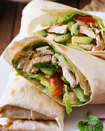 Die marinierten Hühnerstreifen in einer Bratpfanne knusprig braten. In der Zwischenzeit die Tortillafladen kurz im Backofen erwärmen. Die Tortillas mit Dressing bestreichen, mit Rucola, Sprossen, Avocado, Tomaten und Hühnerstreifen belegen. Die untere Seite einklappen, den Fladen vorsichtig einrollen und servieren.
