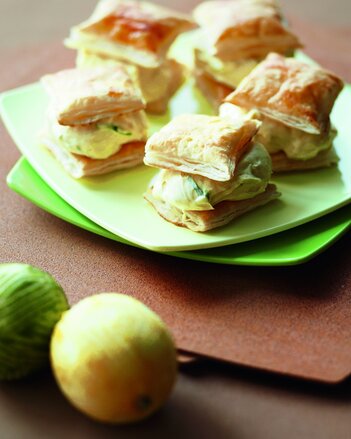Blätterteig ausgerollt auf ein Backblech legen, der Länge nach halbieren und mit Ei bestreichen. Im vorgeheizten Backrohr 10 Min. bei 200 °C anbacken und bei 160 °C 10 Min. weiterbacken. Aus dem Ofen nehmen und auskühlen lassen.