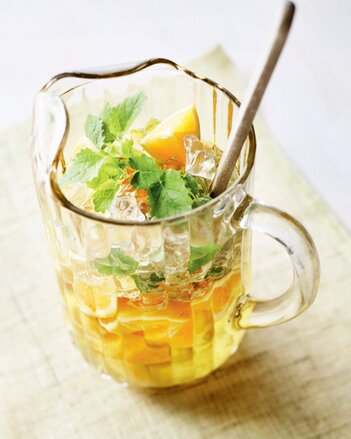 Das Glas mit Eis anfüllen und mit Mineralwasser aufgießen. Mit einer Orangenscheibe und Melisse garnieren und mit einem Strohhalm servieren.