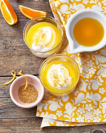 Sahne unterheben und das Gewürz und 2 EL Zucker zugeben und vermischen. Joghurtmasse in vier Gläser verteilen und für ca. 1 h kühl stellen.