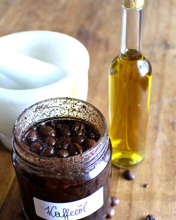 Die Kaffeebohnen gut zerkleinern (am besten mit einem Mörser) und zu zwei Drittel in ein sauberes Marmeladenglas füllen. Anschließend das Gefäß mit Jojobaöl aufgießen, verschließen und kräftig schütteln.