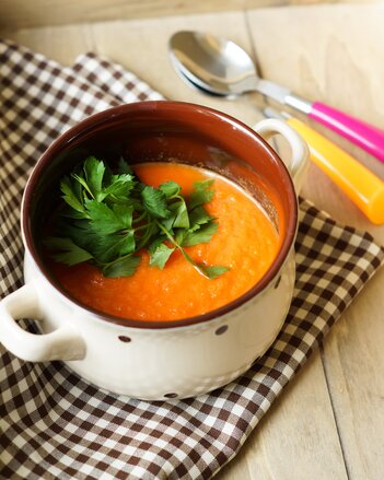 Auf dem Foto ist ein Topf mit Karottensuppe zu sehen. Darin sieht man Petersilie. Neben dem Topf sind zwei Löffel zu sehen. | © SONNENTOR