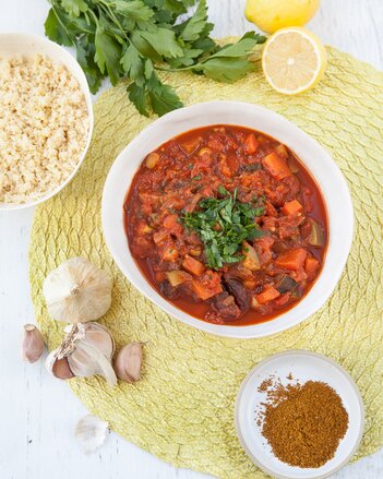 Petersilie waschen, trockenschütteln, Blätter abzupfen und fein hacken. Tajine auf einem tiefen Teller anrichten, mit frischer Petersilie bestreuen und gemeinsam mit dem Couscous servieren.
