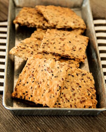 15 Min. backen, dann in die gewünschten Stücke schneiden und weitere 35 min. backen. Das Knäckebrot unbedingt nach 15 Min. schneiden, sonst klappt es nicht mehr.