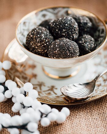 Die Schokoladenmasse nun zu kleinen Kugeln formen und in Chia Samen wälzen. Kühl lagern und frisch genießen.