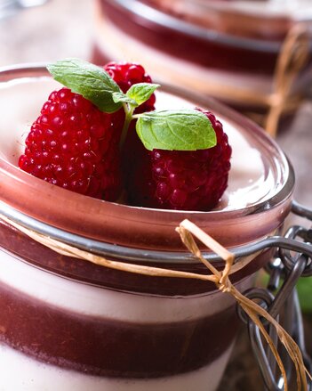 Abwechselnd die Pannacotta und das Fruchtdessert in Gläser füllen. Vor dem Verzehr mit Alles Liebe Gewürz-Blüten-Mischung bestreuen.