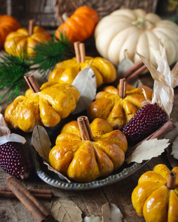 Wenn sie fertig sind, die Kürbisbrötchen aus dem Ofen geben, Garn entfernen und in jedes Brötchen eine Zimtstange als Stängel stecken. Als Abschluss die Brötchen noch einmal mit wenig Öl bepinseln oder gleich das warme Kürbisbrötchen genießen.