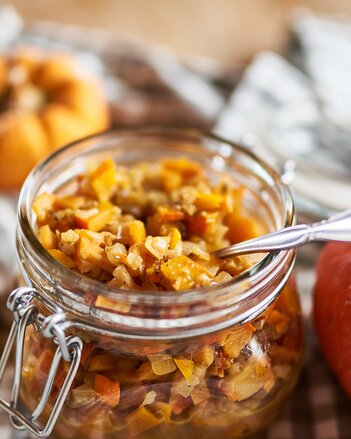 Öl in einem Topf heiß werden lassen und die Zwiebeln darin glasig dünsten. Nach und nach den Kürbis und die Apfelstücke hinzufügen und ständig umrühren. Mit Apfelessig und Wasser aufgießen und die Gewürze hinzugeben.