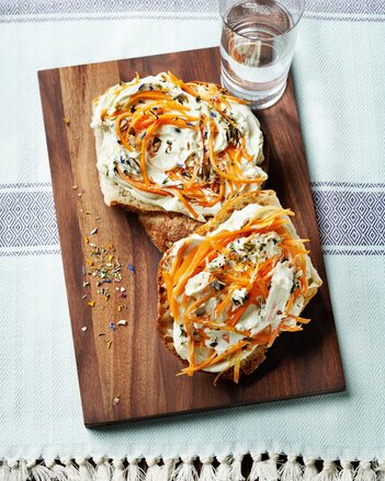 Frischkäse mit Kürbiskern-Öl cremig rühren. Karotte reiben oder fein stiftelig schneiden.