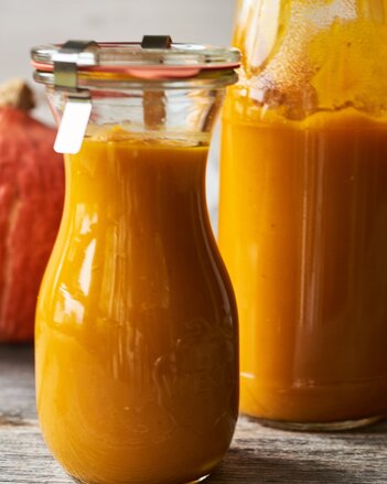 Das fertige Kürbisketchup nochmal abschmecken und in heiße, steriliserte Gläser oder Flaschen füllen und sofort verschließen.