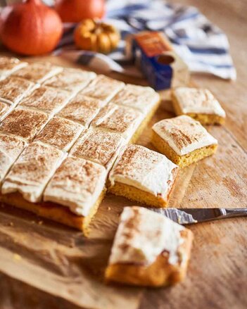 Das Mehl mit Gewürzen (Zimt, Salz, Vanille), Nüssen und Backpulver vermischen. Den geraspelten Kürbis unter die schaumige Eiermasse rühren und anschließend abwechselnd die Buttermilch und Mehlmischung unter den Teig rühren.