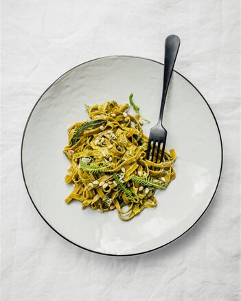 Kurkuma-Bandnudeln mit Schafgarben-Zitronen-Pesto