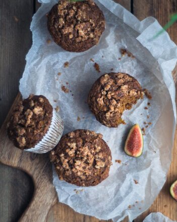 Separat in einer Schüssel alle trocken Zutaten, also geriebene Walnüsse, Buchweizenmehl, geriebene Haferflocken, Kurkuma, Zimt, Ingwer, Natron, Backpulver und Salz zusammenmischen und danach in die Eier-Mischung geben. Abschließend die Rosinen beimengen.