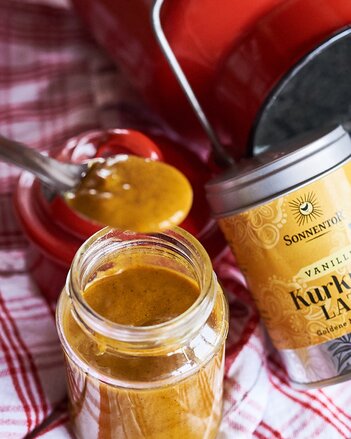Kräftig gelber Kurkuma Latte Vanille Pudding.