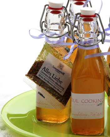 Anschließend die Lavendelblüten (in einen Teefilter, Sieb oder Tee-Ei) dazugeben und ca. 1 Stunde ziehen lassen. Je nach gewünschter Intensität kann man sie auch länger ziehen lassen, aber Vorsicht wenn es zu lange wird könnte es zu herb/dominant werden.