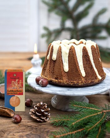 Den Lebkuchengugelhupf im vorgeheiztem Backofen bei 175° C Heißluft für rund 50 Minuten backen. Nadelprobe machen! Fertigen Gugelhupf aus der Form stürzen und auskühlen lassen.