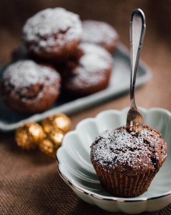 Die Muffinförmchen bereitstellen und je mit ca. 1,5 gehäufte Esslöffel Teig füllen. Die Muffins nun für ungefähr 25 Minuten backen. Abkühlen lassen und mit Puderzucker bestäuben.