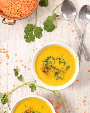 Mit Orangensaft und Wasser aufgießen. Linsen hinzufügen und weich kochen.