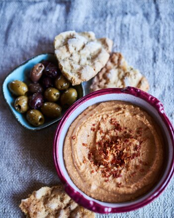 Gekochte Linsen mit Olivenöl und Tomatenmark fein pürieren.