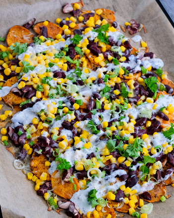 Die heißen Süßkartoffeln mit den Bohnen, Mais, Frühlingszwiebeln und dem geriebenen Käse bedecken und nochmal ein paar Minuten in den Ofen geben, damit der Käse schmilzt.
