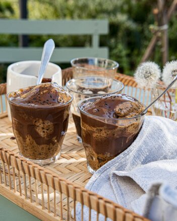 Die halbgefrorene Eismasse abwechselnd mit selbst gemachter Schokocreme in 4 kleine Gläser oder Schüsseln schichten.
