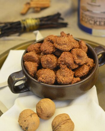 Auf dem Foto ist ein Top mit Maroni Keksen zu sehen. Davor liegen drei Walnüsse. | © SONNENTOR