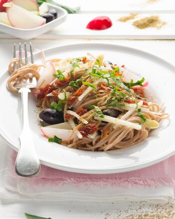 Spaghetti in reichlich Wasser kochen, Spargel und Kohlrabi schälen und ebenso wie die Radieschen und die getrockneten Tomaten klein schneiden.