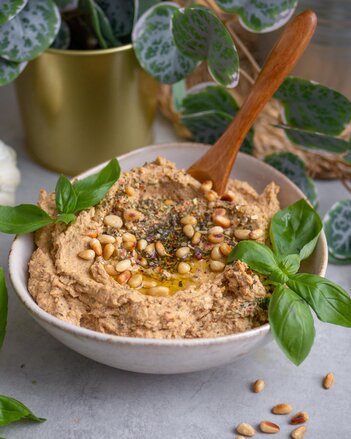 Dieser mediterraner Tofu-Dip erinnert durch Basilikum, Pinienkerne und dem Pizza-& Pasta Gewürz an den letzten Urlaub am Meer.