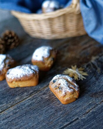 Nach dem Backen sofort aus den Formen lösen und mit geschmolzener Butter bestreichen und mit Staubzucker bestreuen. Für den Extra-Geschmack kommt über jeden kleinen Gewürzstollen noch eine Prise Chai-Küsschen.